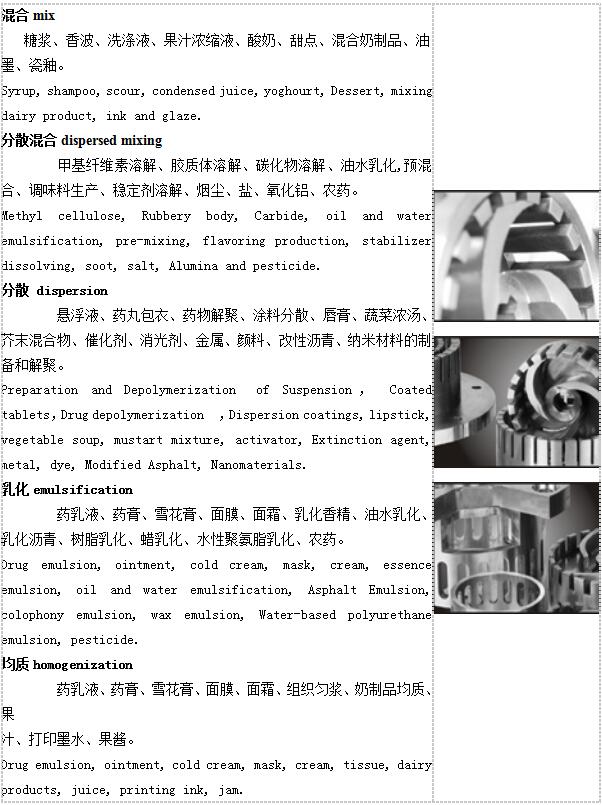 It is highly efficient, fast and equably to distribute 1 phase or several phases to a continuous one. But normally they are not dissolvable with each other. Under use of techniques and proper additives, high tangent speed and strong kinetic energy generated by high speed rotary rotor and mechanical effects can lead to instant, equally, subtly and dispersed emulsification of solid phase, liquid phase and gas phase. After high frequency reciprocating circulation you can get high quality steady product.